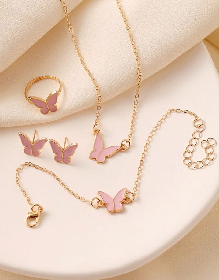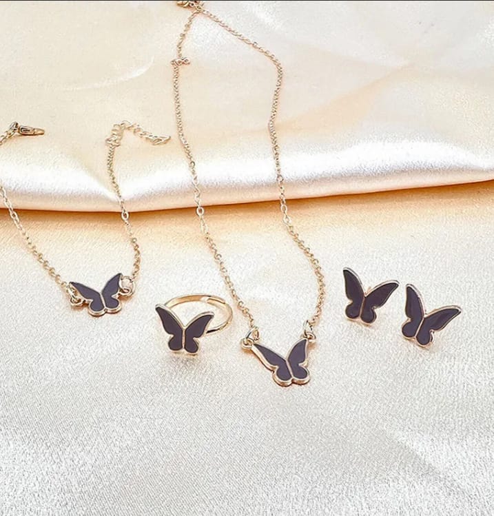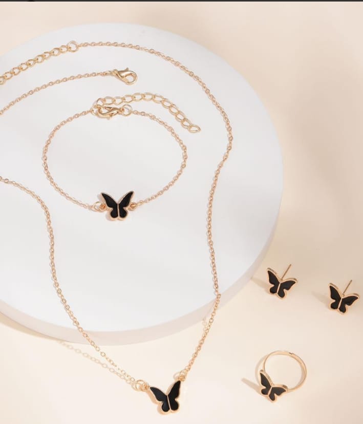 Elevate your accessory game with our Midnight Butterfly 4-Piece Jewelry Set, a perfect blend of whimsical charm and sophisticated bold style. While butterflies are often seen as purely delicate, this set features a striking contrast of deep black enamel wings framed by high-shine gold-tone plating, giving the classic motif a modern, “cool-girl” aesthetic.